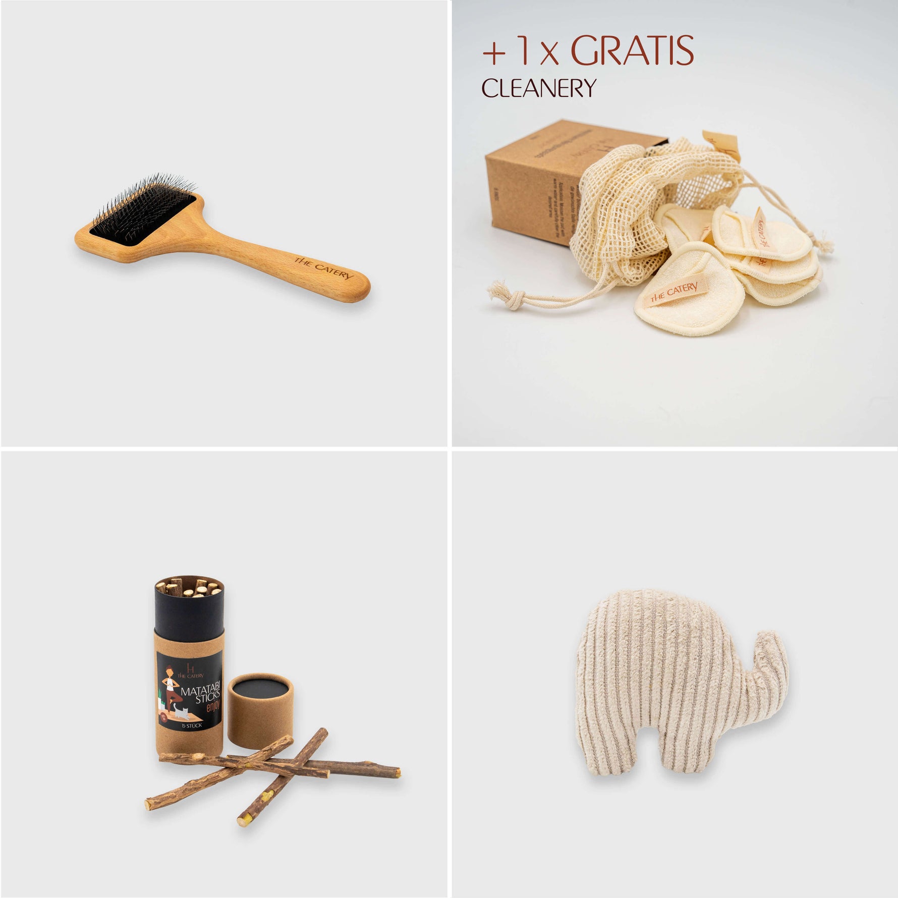 Entdecke das Wohlfühlpaket für deine Katze: Dieses exklusive 4er-Set vereint hochwertige Produkte, die Pflege, Spiel und Gesundheit in den Alltag deines Lieblings integrieren. Ob Fellpflege, Zahngesundheit oder Spielspaß – mit diesem Bundle machst du deinem Stubentiger und der Umwelt eine Freude. Und das Beste: Die Cleanery Reinigungspads gibt es gratis dazu!